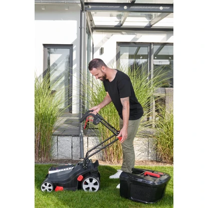 Mit nur einem Handgriff können Sie bequem die Schnitthöhe in 6 Stufen von 20 mm bis 75 mm einstellen. Die große Gewebefangbox mit Füllstandsanzeige fasst bis zu 45 l. Für den leichten Transport sorgt ein zweckmäßiger Tragegriff, und der angenehme Bügelschalter steht für mehr Fahrkomfort.