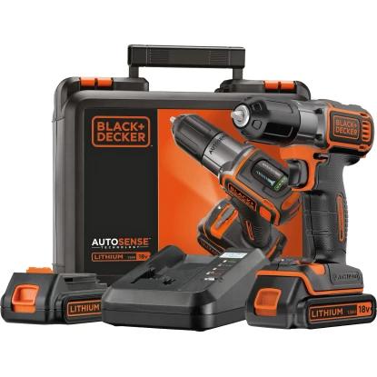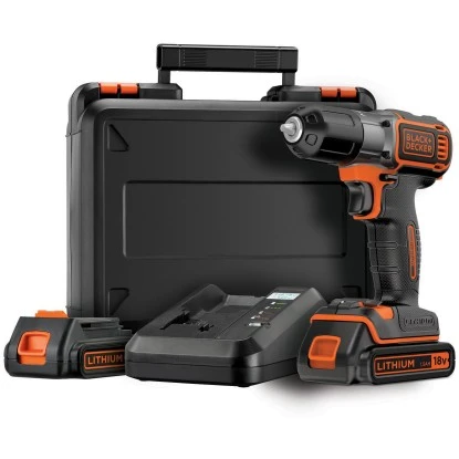 Der kompakte Akku-Bohrschrauber ASD18KB von Black+Decker ist der ideale Helfer bei leichten bis mittelschweren Bohr- und Schraubarbeiten in Holz und anderen Materialien. Dank kabellosem Betrieb lässt sich das innovative Akku-Gerät jederzeit unabhängig von Stromquellen flexibel einsetzen und bietet Ihnen so maximale Bewegungsfreiheit beim Schrauben und Bohren. Ausgestattet ist der Akku-Bohrschrauber mit zwei hochwertigen Lithium-Ionen-Akkus mit einer Leistung von 18 V. Sie weisen eine Kapazität von 1,5 Ah auf und zeichnen sich durch ihre robusten und langlebigen Eigenschaften aus – kein Memory-Effekt, keine Selbstentladung. Die integrierte Ladestandsanzeige ermöglicht Ihnen jederzeit die Überprüfung der verbleibenden Leistung. Mit dem im Set enthaltenen Ladegerät sind die Akkus innerhalb von nur einer Stunde voll aufgeladen.