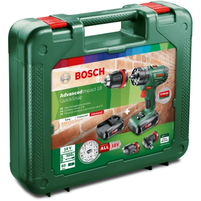 Der leistungsstarke Akku-Schlagbohrschrauber AdvancedImpact 18 Quicksnap von Bosch ist die ideale Unterstützung bei vielfältigen Bohr- und Schraubarbeiten in Holz und anderen Materialien. Das innovative Akku-Gerät bietet Ihnen dank kabellosem Betrieb maximale Bewegungsfreiheit beim Schrauben und Bohren und lässt sich jederzeit unabhängig von Stromquellen flexibel verwenden. Der Akku-Schlagbohrschrauber ist mit zwei hochwertigen Lithium-Ionen-Akkus mit einer Leistung von 18 V ausgestattet. Die integrierte Ladestandsanzeige ermöglicht Ihnen stets die Überprüfung der verbleibenden Leistung. Mit dem im Set enthaltenen Ladegerät beträgt die Ladezeit der Akkus lediglich eine Stunde.