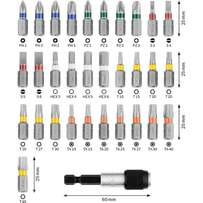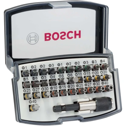 Das Bosch Schrauberbit-Satz verfügt über eine überdurchschnittliche Härte und bewältigt problemlos die unterschiedlichsten Anforderungen. Das Set besteht aus 32 verschiedenen Schrauberbits. Praktischerweise wird das es in einem kleinen und kompakten Etui mit transparentem Deckel geliefert. So haben Sie immer alles griffbereit.
