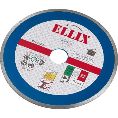 Die Trennung und Teilung von Fliesen ermöglicht die ELLIX Diamanttrennscheibe mit 200 mm Ø. Nutzbar ist sie für Keramik und Fliesen. Sie hat eine Scheibentiefe von 2 mm. Die Normbohrung beträgt 25,4 mm.