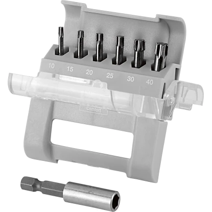 In hochwertiger Qualität aus Stahl hergestellt, eignet sich das 7-teilige LUX-TOOLS Bitbox Set Comfort Torsion-TX für den privaten handwerklichen Bereich. Es zeichnet sich durch seine Langlebigkeit und gute Standzeit aus. Das Set umfasst die gängigen Größen TX10, TX15, TX20, TX25, TX30 und TX40 sowie einen magnetischen Bithalter. Das Antriebsprofil ist sternförmig angelegt, es besteht aus insgesamt 6 Nocken. Die Vorteile liegen darin, dass Sie TX-Schrauben mit einem wesentlich höheren Antrieb eindrehen können, ohne das Profil zu beschädigen. Zudem wird weniger, bis gar kein Anpressdruck bei der Arbeit beispielsweise mit einem Handbohrer oder Akkuschrauber benötigt.