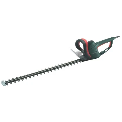 Durch beidseitig diamantgeschliffene Messerzähne im Winkel von 30° wird ein sauberer Schnitt erreicht und die Sicherheits-Untermesser garantieren eine hohe Arbeitssicherheit. Die Metabo S-automatic Sicherheitskupplung schützt Messer und Getriebe bei Blockieren durch Fremdkörper. Durch einen ergonomisch geformten Bügelgriff kann besonders ermüdungsarm gearbeitet werden. Eine besondere Laufruhe wird über das gegenläufige Scherenmesser erreicht. Die Heckenschere ist besonders servicefreundlich durch eine Kabelwechselklappe. Eine Kabel-Zugentlastung verhindert die unbeabsichtigte Trennung der Kabel-Steckverbindung und der Anstoßschutz mit Zweigzuführung schützt den Anwender und das Getriebe vor Rückschlägen.